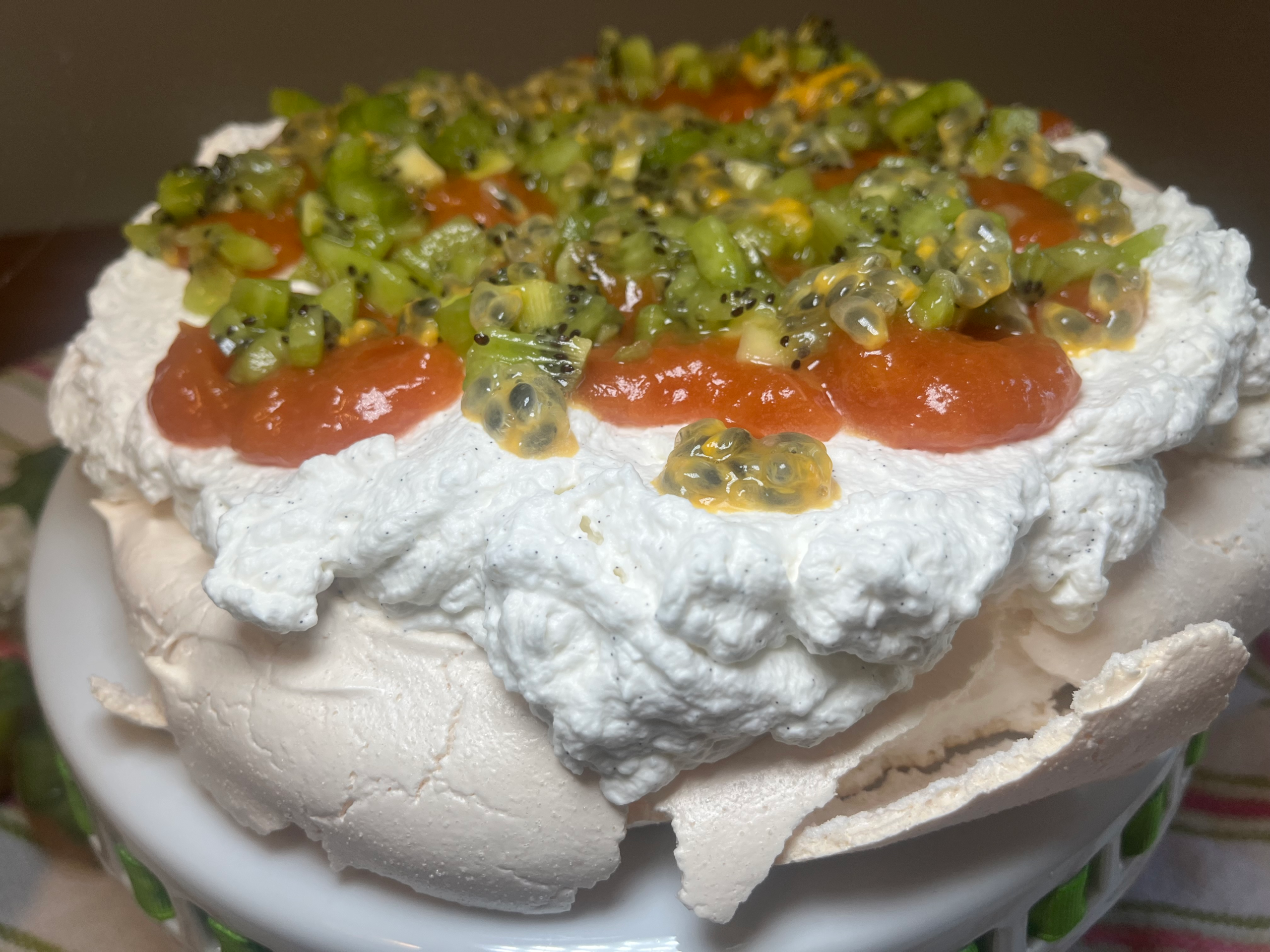 Le Pavlova est une délicatesse qui origine de la Nouvelle-Zélande ou de l’Australie en l’honneur d’une danseuse de ballet russe, Anna Pavlova. Essentiellement, c’est une recette de meringue nappée d’une crème chantilly et des fruits. La particularité de la meringue pour ce dessert est qu’elle est croustillante et sucrée à l’extérieure et « nuageuse » à l’intérieure.J’aime bien faire cette délicatesse avec une compote de pêche maison avec des kiwis…. et des fruits de la passion ! Vous pourriez aussi faire ce dessert avec des fruits des champs et une confiture de petits fruits. Dans tous les cas, je vous recommande vraiment d’essayer avec des fruits de la passion car ce fruit donne vraiment un petit goût unique à ce dessert. Pour ma part, j’ai découvert les fruits de la passion en Martinique, avec mon conjoint. On était dans la piscine de notre hôtel, puis on s’est commandé un gros plateau de fruits, avec des fruits de la passion. On a été tous les deux charmés par la saveur de ce fruit hors du commun.C’est un dessert qu’on ne mange pas tous les jours et c’est certainement une sorte de dessert qui fait jaser la visite! Personnellement, je trouve que, esthétiquement, c’est un très beau dessert et, quand on connaît l’histoire de ce dessert, la forme peut nous faire penser à un tutu de ballet!